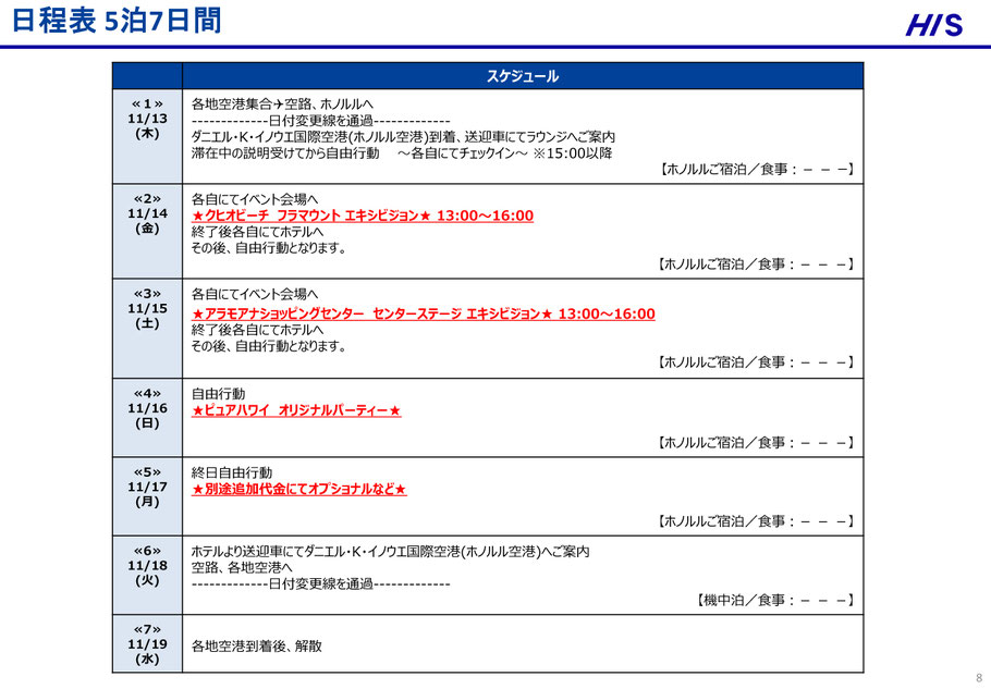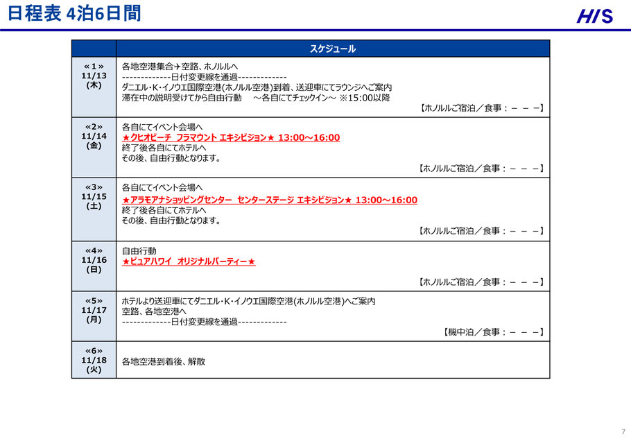 11月13日(木)関西空港発 20時45分 11月13日(木)ホノルル着 9時35分