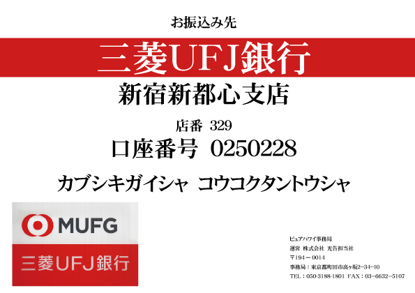194-0014東京都町田市高ヶ坂2ー34ー10 株式会社 光告担当社 ピュアハワイ事務局