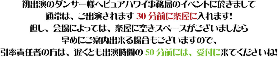 ダンサーの引率責任者の方は、遅くとも出演時間の50分前には、受付に来てくださいね!